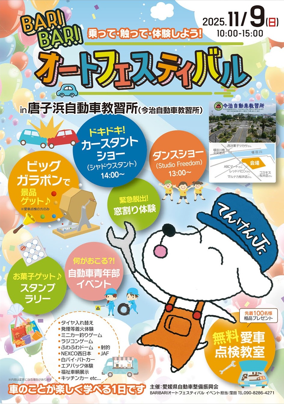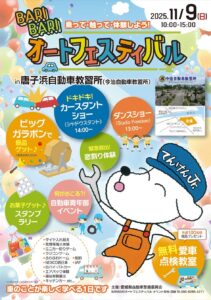 自動車ユーザーに、クルマの点検の重要性や交通安全について学んでもらおうと、去る令和7年11月9日(日)、今治市の今治自動車教習所(愛称:唐子浜自動車教習所)で、『BARIBARIオートフェスティバル in 唐子浜自動車教習所』を開催しました。今治支部での開催は、平成30年以来7年振りとなります。